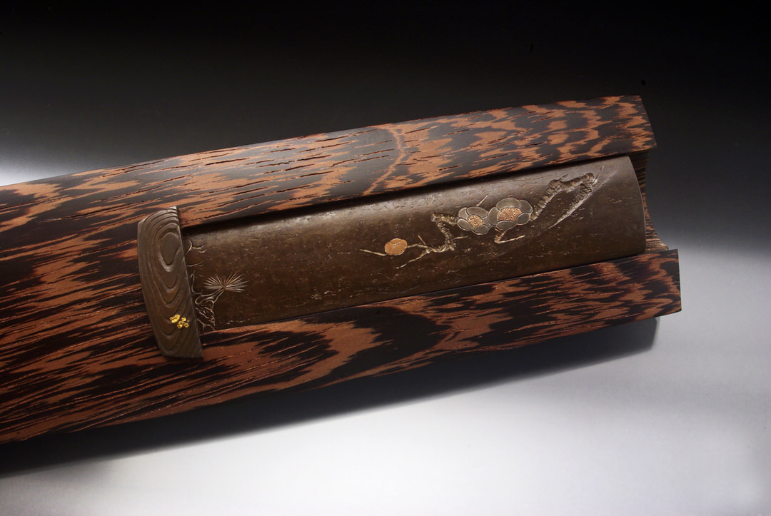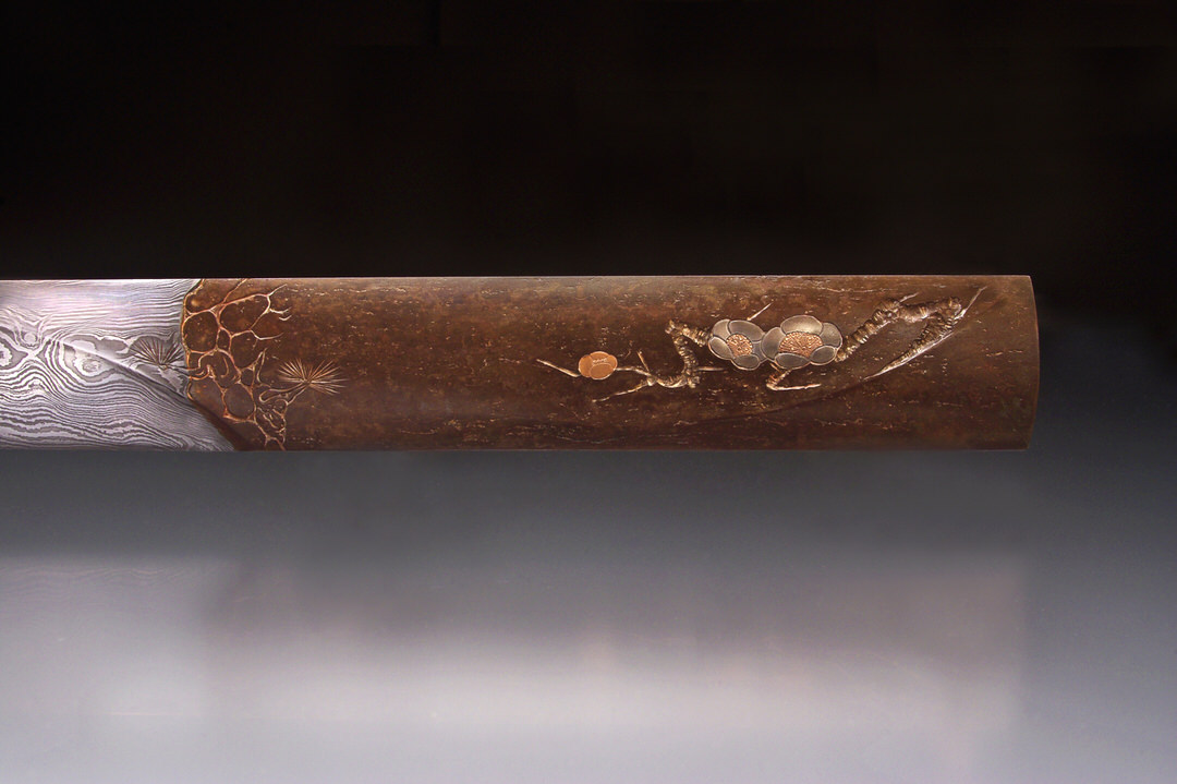 The style of engraving for the plum branch and blossoms is called kosuki-bori, practiced by Goto Ichijo (1791-1876) and passed to his student Funada Ikkin (1812-1863). It was mostly used to portray plum branch design. The plum blossoms are inlayed pure silver with rose-gold centers, which have engraved details and punched raised dot stamen-tips. The pine design served as a transition from the patterned blade steel to the iron handle with one small pine branch on the iron and another forward on the steel.
