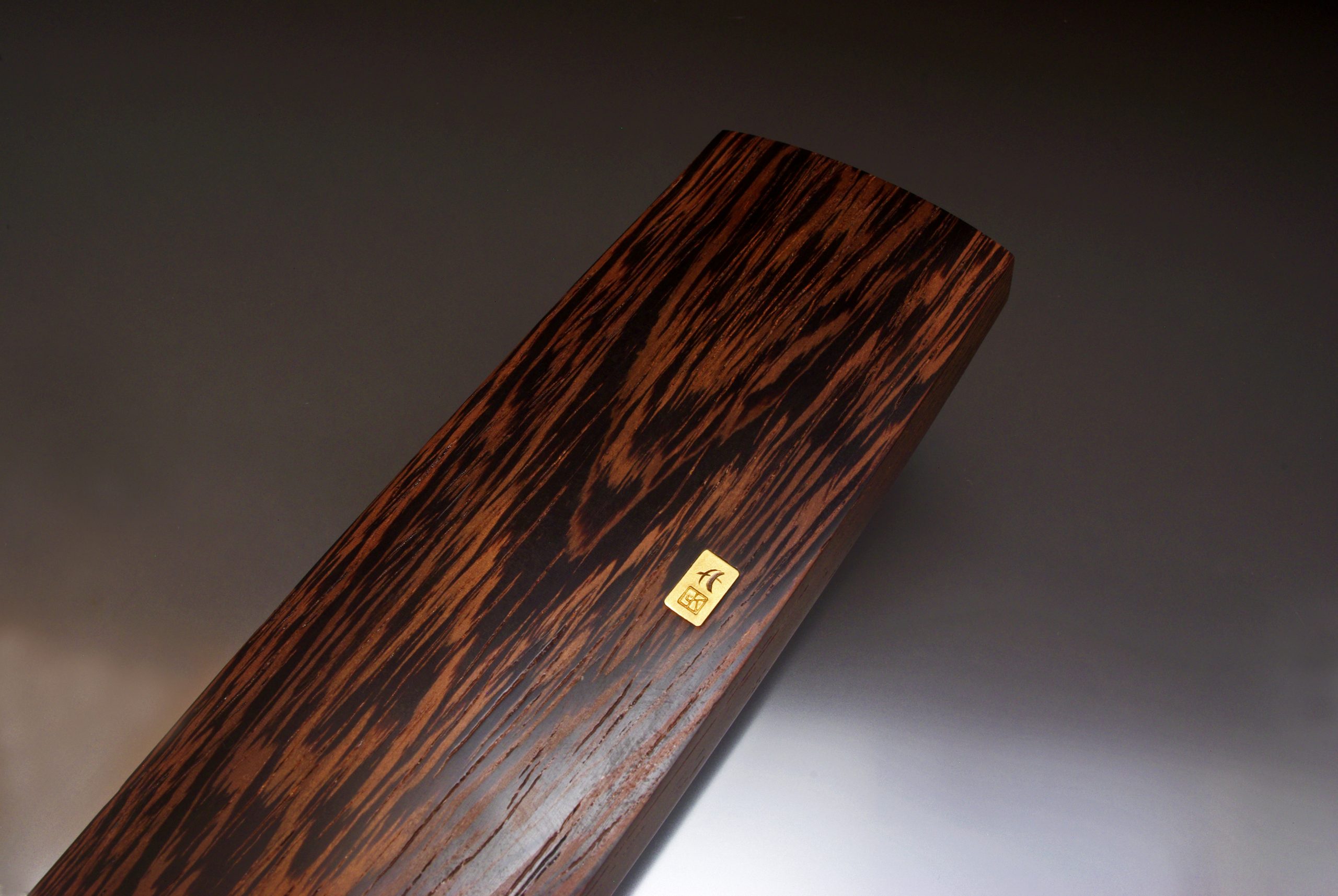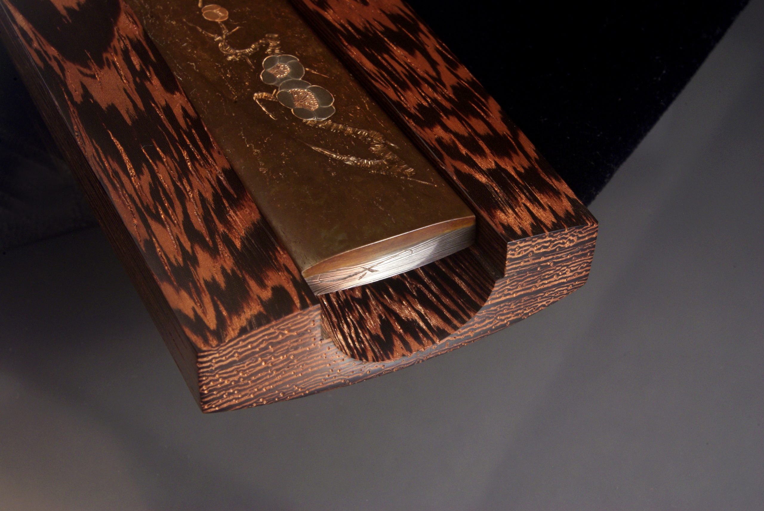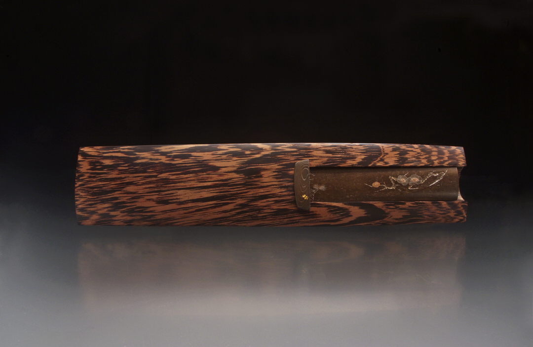 The shibuichi throat piece was carved in a wood-grain pattern and has 24k gold inlaid lichen.It was patinated with the traditional Japanese niage process. The saya/sheath is made from Wenge wood and was chosen for its pattern and colors harmonious to the iron patina. I am very happy with this knife and, particularly with Nick, a return to a collaborative relationship merging skills, personality and artistic approach.